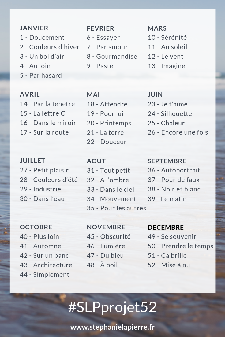Je vous présente un nouveau projet photo et cette fois-ci un projet personnel: Le défi photo 52. Un challenge que j’ai nommé : le #SLPprojet52. L’idée est très simple :  52 semaines = 52 thèmes = 52 photos.